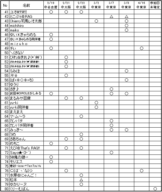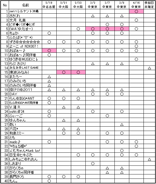 【4月21日更新】 大変遅くなり本当にすみません… ご自由にお持ちください。 ついでに是非是非またマイミク募集しちゃったりしてください!! もちろん企画者も随時激しくマイミク募集中なのでお気軽に申請を!! みなさんのおかげでいままでで一番楽しいライブでした。 またやりましょうね。 ありがとうございました。 画像は企画者のアルバムにあります。 下記からもとべます。 http://photo.mixi.jp/view_album.pl?album_id=500000017211256&owner_id=19946247 参加者専用のコミュ ◆ハングリーハイテンションの集い