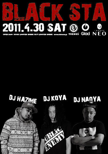 毎月第5土曜日限定のBIG PARTY☆ その名も★BLACKSTA★ VUENOS、GLAD、NEOの三店舗連動で開催です! GUESTにはDJ HAZIMEDJ KOYADJ NAOYAの3人他豪華出演者でお送りします! 通常だと ☆3000円☆ 掛かってしまう入場料ですが、下記の手順で ★2000円2ドリンク★ の格安ディスカウント料金にてご案内致します! ※☆「お名前+大体の人数」☆※ を添えてメッセージ頂ければ、 ★2000円2ドリンク★ の格安ディスカウント料金にてご案内致します! 行けるか解らない! 人数がはっきりしない! という方でも構