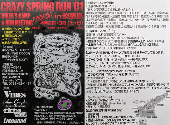 前回 C・S・R'00では多くの皆さんの、ご参加有り難うございました 今年も4月の第一土日、C・S・R'01を開催します 『CRAZY・SPRING・RUN・MTG'01』 CRAZY・SPRING・RUN'01(通称 C・S・R'01)では、走り&キャンプミ−ティングの、C・S・Rを一歩進めた企画で開催します ※開催日:2011年4月2日(土)〜3日(日) ※開催場所:南淡路市阿万塩屋町じゃのひれ・じゃのひれオ−トキャンプ場 ※会場 OPEN:2日(土)12時 ※会場 CLOSE:3日(日)12