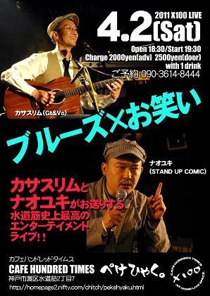 【ブルーズ×お笑い】 癒しのブルーズメン「カサスリム」と ぼやきのスタンダップコミック「ナオユキ」がお送りする 水道筋史上最高のエンターテイメントライブ 「ジワァ〜とくるやろ」 ■2011.4.2(Sat) ■出演 カサスリム(Vo&Gt) http://www.sparkle.org/slim/ ナオユキ(Stand Up Comic) http://naoyuki.otaden.jp/ ■OPEN 18:30/START 19:30 ■Charge 2000yen(ご予約)2500yen(当日)共にワンドリンク付 ■場所:カフェハンドレッドタイムス〜ぺけひゃく。〜 神戸市灘区水道筋2丁目7 http://homepage2.