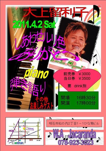 今年もまた、春になるとルリ色ルリコさんが西明石Jacaranda&おもちゃ箱へ 出演:大上留利子 (ピアノ弾き語り) その他お楽しみゲスト。。。。 日時:2011年4月2日(土曜日) 開場:16:30 開演:17:00 前売:3000円(予約可) 当日:3500円 ドリンク別途 場所:Jacaranda&おもちゃ箱 http://r.goope.jp/jaca-omochabaco/top 明石市松の内2丁目1−1 ひな菊ビル1F TEL:078-923-3023 JR西明石駅から北へ5分、セブンイレフ