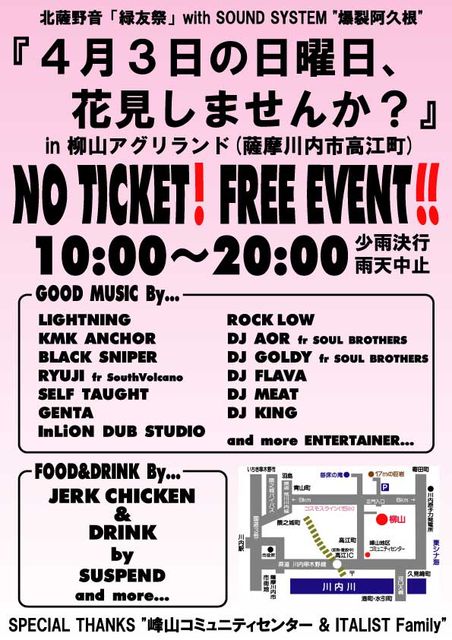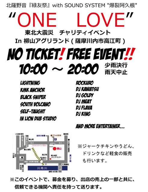 被災地の人達の為に 何か出来ることはないか、とみんな考えてます 一人一人の力を大きな一つにして いまこそ ONE LOVE ということで 4月3日行われます、 北薩野音『緑友祭』 【4月3日の日曜日、花見しませんか?】in 柳山アグリランド を 急きょ 変更しまして 北薩野音『緑友祭』 with SOUND SYSTEM "爆裂阿久根" Operation RYOKUYU-SAI 『東北大震災 チャリティイベント ”ONE LOVE”』 in 柳山アグリランド と改めました。 このイベントで、募金を募り 出店の売り上げなどを義援金として