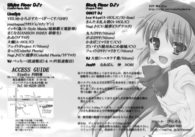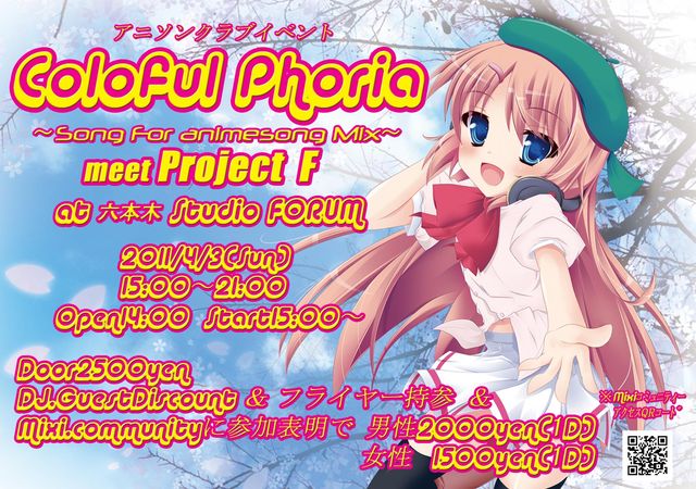 colorfulphoria meet Project F - song for anison Mix- @ 六本木studio FORUM[スタジオフォーラム] 2011/4/3(Sun) 15:00〜21:00 open14:00 start15:00 Door2500YEN(1D) TCPTディスカウント&mixiコミュニティ参加表明&フライヤー&Staffディスカウント で男性2000YEN(1D)女性1500YEN(1D) mixiコミュニティ参加表明フォーム http://mixi.jp/view_event.pl?id=60313988&comment_count=0&comm_id=5164416 ☆TRANCEやHARD、TECHNOやHOUSEまで生粋のCLUBSOUNDを発信し続けるCLUBイベント界の老舗、TCPTが打ち出すア