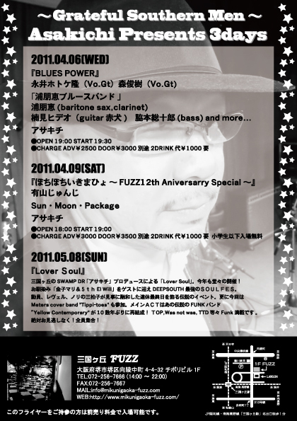 南部のオトコ「Asakichi」入魂の3Days @三国ヶ丘FUZZ いよいよ4/06からスタート! ワイルドでいこう。 http://mixi.jp/show_friend.pl?id=12283506&_fof http://jp.youtube.com/watch?v=d4-b5F4UTRs {Yellow Contemporary}