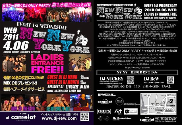 ★★★NEW YORK NEW YORK★★★ 女性は終日入場無料(別途1000円2drink 平日にして平均来客数300人! 先着100名の女性客にDJ ReW Mix CDプレゼント! 4月6日 (水曜日) @ CAMELOT SHIBUYA イベントフライヤー: http://www.sbe-one.com/files/SBE_Camelot_Shibuya_NY_NY_04062011_web.jpg Presented by SURVIVOR Supported by SBE 女性限定!! 話題のシャンパンNUVOを振る舞います!! 本場NYの クラブの味を! ! 女性限定振る舞いシャンパン、ショットガンもあります!! HIP HOPの聖地"NY"を彷彿させるよ