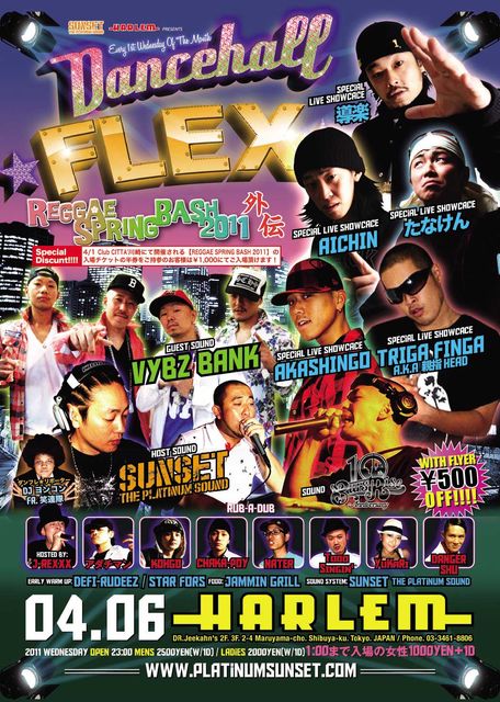 ダンフレにたなけん初登場!!よろしくど〜ぞ〜 第1水曜の東京の決定版ダンスホール【★DANCEHALL FLEX★】! 今月のダンフレは、<<REGGAE SPRING BASH 2011外伝>>!!4.1(金)に川崎CITTA'で開催されるビッグ・ダンス【REGGAE SPRING BASH 2011】の後夜祭とも言えるスピンオフ企画! 東京の二本柱SUNSET、BURST RISEを軸に、導楽、たなけん、AICHIN、AKASHINGO、TRIGA FINGA a.k.a 親指HEADら関東の精鋭アーティスト陣のスペシャル・ライヴ!そしてサウンドには埼玉からVYBZ BANKが初登場!! 現場最前線の顔ぶれそろい踏みで関東の次世代ライン