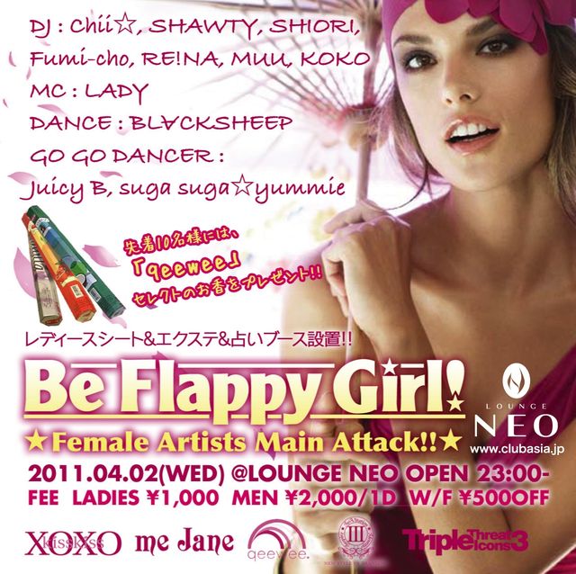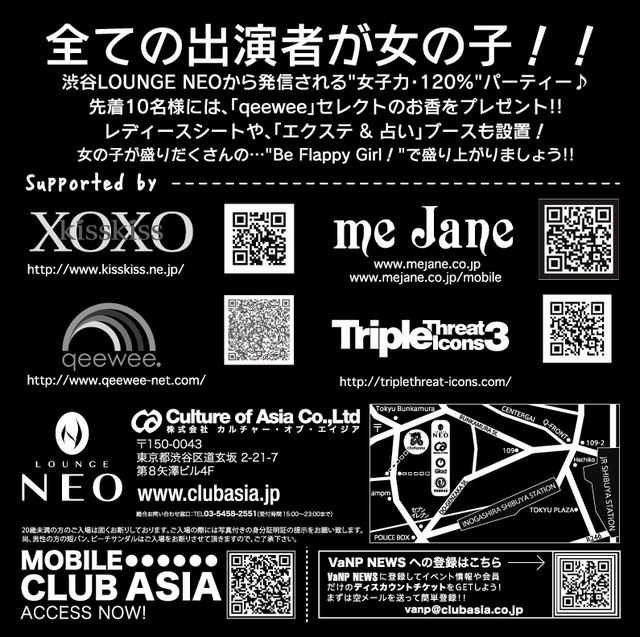 お客様、特に女性が主役のこのパーティーは女性入場無料だけでなくヘアブース、CDプ レゼントなど女性から絶大なる支持を得てい るので毎回女性の方が多い数少ないパーティーです。