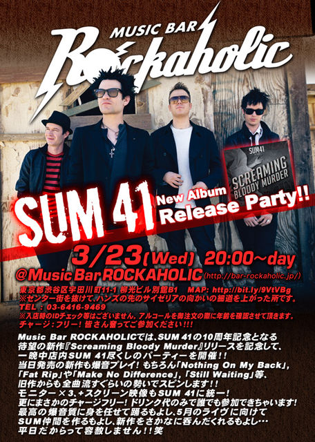 Music Bar ROCKAHOLICでは、SUM41の10周年記念となる待望の新作『スクリーミング・ブラッディ・マーダー』リリースを記念して、一晩中店内SUM41尽くしのパーティーを開催