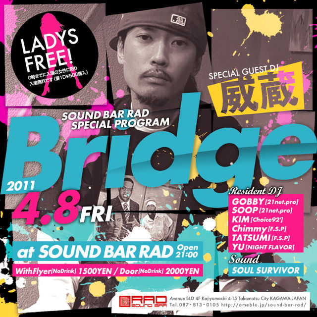 4/8(fri) Bridge ■OPEN 21:00 0時までに入場の女性は入場無料 ■WITH FIYER : 1500yen / DOOR : 2000yen ※共に別途1ドリンク代(500yen)必要 ■ SPECIAL GUEST DJ■ 威蔵(VINYL FORCE) ■DJ■ GOBBY (21net.pro) SOOP (21net.pro) KIM (Choice92') chimmy (F.S.P) TATSUMI (F.S.P) YU (NIGHT FLAVOR) ■SOUND■ SOUL SURVIVOR DJ 威蔵(VINYL FORCE) 〜PROFILE〜 "男気"、彼のプレイスタイルはこの言葉によって産み出される。 彼のプレイスタイルを体感した者は、彼を表現するのにこ
