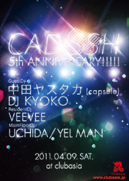 管理人様告知失礼します。 イベントに関する質問は気軽にメッセージお願いします。 5th ANNIVERSARY SPECIAL!!!!!!!! 毎月第二土曜日は、CADISSH!!! 服飾、美容関係者、学生等の支持も厚く、本当の意味で、Fashion+Music+Culture を提案し、あるべきパーティーとしての純粋な刺激、新しさ、イメージを、音楽的サイドからの一方的なものではなく、 ファッション、アート等からの影響を色濃く受け発信している。 動員数、内容、共に、現在ある新しい世代のTOKYOパーティーを、牽引してきたと言っても過言では無い。 また、アーティ