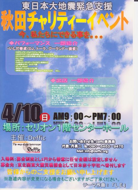 ■趣旨 東北関東大震災義援金 地域ミクロ経済活性化 自粛、不謹慎の閉塞感打破 これら目的の為開催します 不謹慎とは言わせない!一杯楽しんで、元気を被災地へ送ろう ■場所について ポートタワーセリオン1Fセンターホール 10日の9:00開場〜19:00閉場となります。 ■募金に関して ・徴収の仕方 1円からを入場料として、善意に任せ金額は設定しません ・募金先 東北関東大震災義援金として、公益社団法人Civic Force、日本赤十字社、ボランティア市民団体しょしがり秋田へ寄付します。 ・手数料について パフォーマン