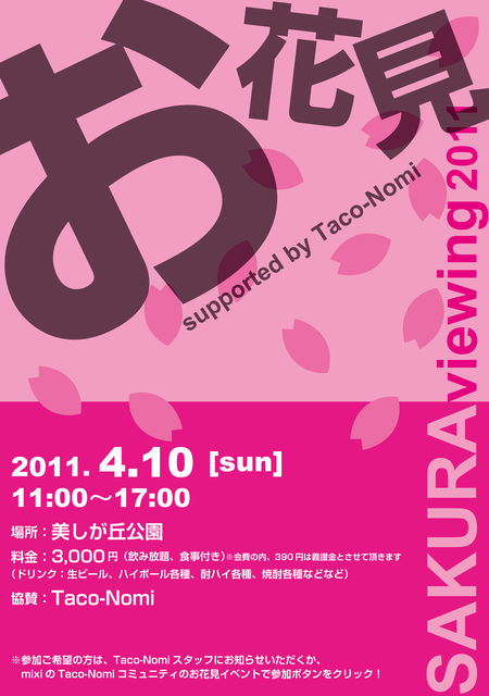 この度の東北関東大震災により、被害を受けられた皆様に謹んでお見舞い申し上げます。 今回、このような状況ですので自粛しようかとも考えましたが、 開催して欲しいという声の方が多いこともあり、お花見開催です 当日はTaco-Nomi さんから飲み物、食べ物の面で全面的なバックアップを受けられる事になりましたので、生ビール、ハイボールなど、お馴染みのメニューも用意しています ちょっとした、出張タコノミです ただ、今回はタコスタッフとも一緒に盛り上がりたいので、基本的に接客はなしでお願いします 自分