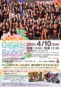 *** 3/21 一部内容変更 *** この度の震災を受けて、急遽内容を一部変更し イベント内で「震災 義援金チャリティ」も行うことになりました。 たくさんの方のご来場お待ちしております! ▼イベントサイト http://sunnyside-gc.com/yokohama/jgb/ ━━━━━━━━━━━━━━━━━━━━━━━━━━━━━━━ Sunnyside Gospel Club横浜 2周年記念チャリティーコンサート 「JOYFUL GOSPEL BRIDGE 」 ━━━━━━━━━━━━━━━━━━━━━━━━━━━━━━━ ♪ゴスペルを歌って国際協力♪ ”BRIDGE" =