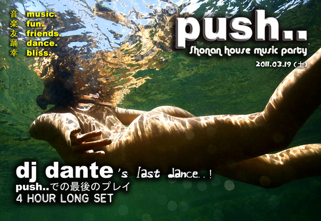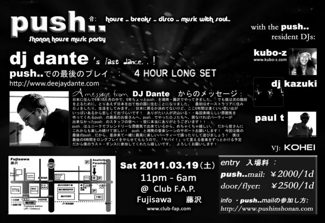 ************************************************************************************ 皆さまへ この度の東日本大地震発生に伴い、3月19日に開催予定しておりましたpush.. を延期させて頂きます。 余震、停電が続く中でお客様とスタッフの安全を考慮したうえでの判断です。 又、東北地方で被災された方々の思い、関東を取り巻く焦りと不安の中でハウス・ミュージック・イベントを遂行するのは適していないと考えました。 ハウスとは喜びと笑顔の中で行う事に意味があり、皆が自然にまた喜び、笑顔でいられる時に行う事が適当と考えまし