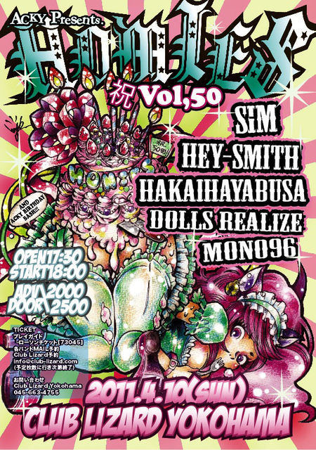2011.4.10(SUN) ACKY presents 【HOMIES vol.50】 @Club Lizard Yokohama OPEN17:30/START18:30 ADV\2000/DOOR\2500 【BAND】 SiM HEY-SMITH HAKAIHAYABUSA Dolls realize MONO96 【DJ】 OHTA(DRAGNET/clutch cafe) JORGE(SKULLSHIT) 【TICKET】 プレイガイド └ローソンチケット【73045】 各バンドMAIL予約 Club Lizard予約 info@club-lizard.com (予定枚数に行き次第終了) お問い合わせ Club Lizard Yokohama 045-663-4755