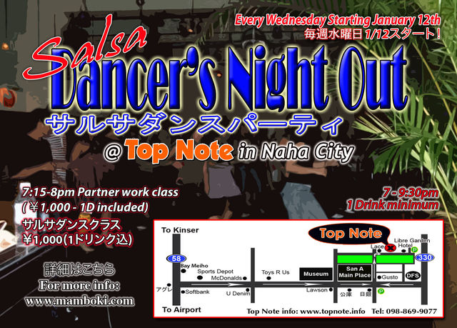 NYクラブスタイルサルサクラスを那覇市と宜野湾市内にて開講しています。サルサは年齢に関係なく長く踊れるダンス。世界中でほぼ毎週サルサコングレスやフェスティバルが開催されるほどの人気で、サルサを通していろいろな国にたくさんの友達を作ることもできます。ぜひ初めてみてはいかがでしょうか★ 那覇市 - ライブハウスTop Note 毎週水曜日 那覇市おもろまち(サンエーメインプレイス裏、リブレガーデンホテル隣) - オープン7pm -クラス7:15pm - 8pm ¥1,000 (1ドリンク込) お気軽にご参加下さい☆