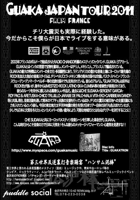 ´ÉÍý¿ÍÍ͹ðÃμºÎ餷¤Þ¤¹¡£ ¡Ö¥Á¥êÂçÃϿ̤â¼ÂºÝ¤Ë·Ð¸³¤·¤¿¡£º£¤À¤«¤é¤³¤½Ëͤ餬ÆüËܤǥ饤¥Ö¤ò¤¹¤ë°ÕÌ£¤¬¤¢¤ë¡× ÅìËÌÃÏÊýÂÀÊ¿ÍβÃϿ̤ÎȯÀ¸¤ò¼õ¤±¡¢GUAKA¤ÎÅìËÌÊýÌ̤θø±é¤¬Ãæ»ß¤Ë¤Ê¤Ã¤Æ¤ª¤ê¤Þ¤·¤¿¤¬¡¢¾¯¤·¤Ç¤âÆüËܤ˸µµ¤¤òÍ¿¤¨¤¿¤¤¤È¤¤¤¦¥á¥ó¥Ð¡¼¤Î°Õ¸þ ¤Ç¡¢ÅìËÌÊýḬ̀ʳ°¤Î¸ø±é¤ò·è¹Ô¤¹¤ë¤³¤È¤Ë¤Ê¤ê¤Þ¤·¤¿¡£ GUAKA¤Î¥á¥ó¥Ð¡¼¤Ï¥Á¥ê¤ÎÂç¿ÌºÒ¤ò¼ÂºÝ¤Ë·Ð¸³¤·¤Æ¤ª¤ê¡¢ÈïºÒÃϤؤλٱç³èư¤Ë¤âÎϤòÆþ¤ì¤Æ¤¤Þ¤·¤¿¡£º£²ó¤ÎÅìËÌÃÏÊýÂÀÊ¿ÍβÃϿ̤Ǥ⡢GUAKA¡¢¥¹ ¥¿¥Ã¥Õ¶¦¡¹ÎϤˤʤꤿ¤¤¤È¹Í¤¨¤Æ¤ª¤ê¤Þ¤¹¡£ ¥Ï¥ó¥µ¥àÅ¥ËÀpresents GUAKA JAPA