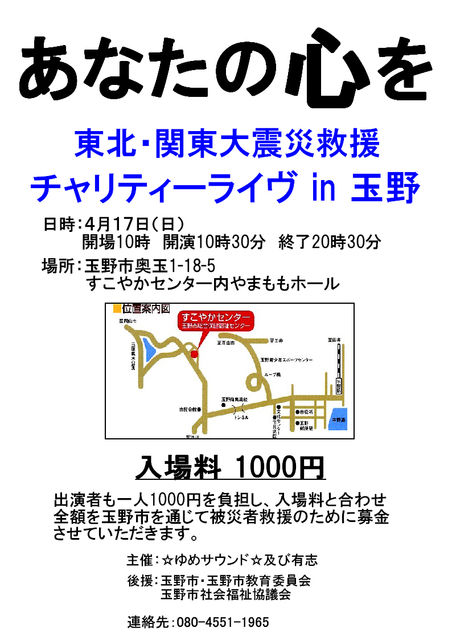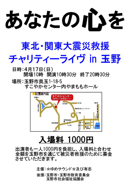 「東北・関東大震災チャリティーライヴ in 玉野」 日時:4月17日(日) 開場10時、開演10時30分、終了20時30分 場所:玉野市奥玉1-18-5 すこやかセンター内やまももホール 入場料 1,000円 出演者も一人1,000円を負担し、入場料と合わせ全額を玉野市を通じて被災者支援のために募金するとのこと。