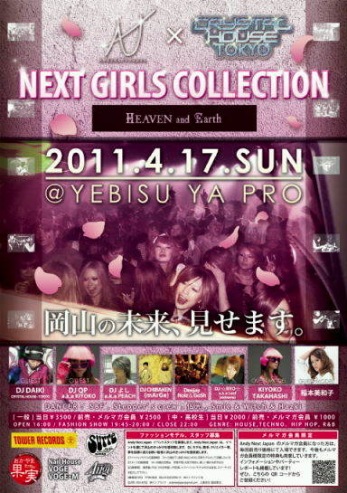 管理人様、告知失礼いたします。 不適切であれば削除お願いいたします。 岡山の皆さんお待たせいたしました 〜『NEXT GIRLS COLLECTION』〜 が岡山CLUB『YEBISU YA PRO』で開催されます ファッションとDANCE MUSICを主体としたPARTYで、あの全国のギャルから圧倒的な支持、人気を誇るファッションブランド 『HEAVEN and Earth』を迎え、 なんと『HEAVEN and Earth』のファッションショーを開催します