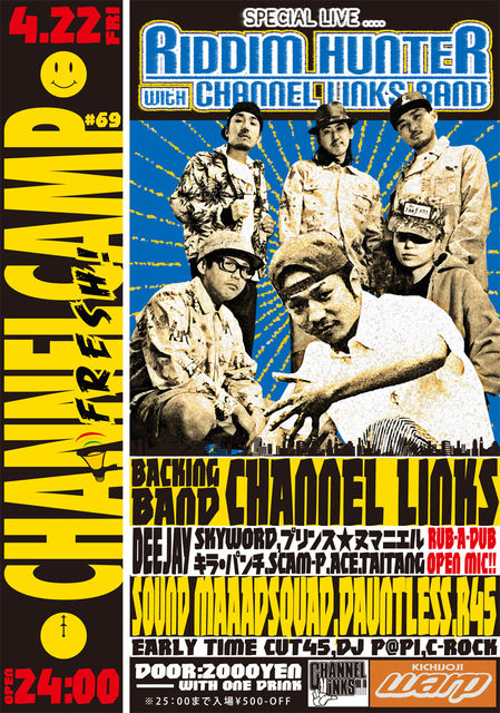 2011.4.22[FRI] "CHANNEL CAMP #69" - FRESH! - @吉祥寺WARP ■SPECIAL BAND SHOW -RIDDIM HUNTER ■BACKING BAND -CHANNEL LINKS ■DEEJAY -SKYWORD -プリンス★ヌマニエル -キラーパンチ -SCAM-P -ACE -TAITANG and OPEN MIC! ■SOUND -MAAAD SQUAD -DAUNTLESS -R45 ■EARLY TIME -CUT45 -DJ P@PI -C-ROCK ■FOOD -GOOD WOOD TERRACE -おかしなまちおか OPEN / 24:00 DOOR / 2000YEN[W1D] ◆吉祥寺WARP 武蔵野市吉祥寺本町1-30-10. TEL0422-22-3516 [問] channe