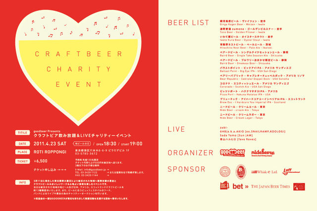 4/23土曜日 地ビールの日 ROTI ROPPONGI OPEN18:30 START 19:00 東京都港区六本木6-6-9ピラミデビル1F クラフトビア飲み放題&LIVEチャリティーイベント CRAFTBEER All-you-can-drink!!! &LIVE Charity 被災された地域のクラフトビール及びアメリカ、スコットランド 日本のビールを用意して、お待ち申し上げます。 また、LIVE チャリティーオークションなどやります! 是非、ご参加ください! 収益金の一部は被災地への復興支援のため、救援活動を支援する団体へ寄付いたします。 ベアードビー