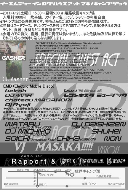 2011年4月23日 EMD-Electric Mobile Disco- at HIMEJI MAKINO CAMPSITE!!!!!! http://mixi.jp/view_community.pl?id=2638766 当日はキャンプファイヤー、カフェ、暖かい食べ物、ライブペイントetc... キャンプ場内では各々BBQ持ち込みOKです。 【詳細】 キャンプインBBQレイブパーティ!!!!!!! 春風を浴びながら 山の中で自然と肉と音楽に浸りましょう! 場所:姫路牧野キャンプ場 http://www2.wagamachi-guide.com/himeji/Map.asp?id=57800&isslist=on 日時:4月23日(土) キャンプイン:15:00〜