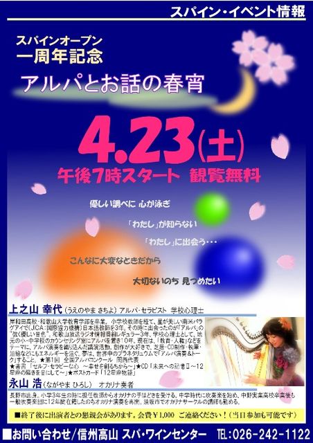 スパイン オープン一周年記念コンサート アルパとお話の春宵 http://yumo.naganoblog.jp/e707072.html