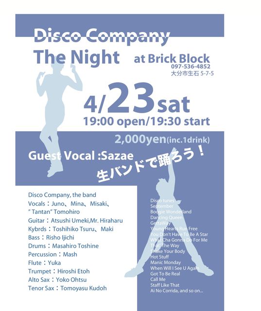 70s-80sのディスコ・ヒットナンバーを引っさげて、ボーカル4人がファンキーにセクシーに、ホーンセクションがホットにパワフルに、リズムセクションが、タイトにグルーヴィーにDisco Companyがお届けします。