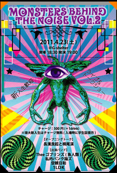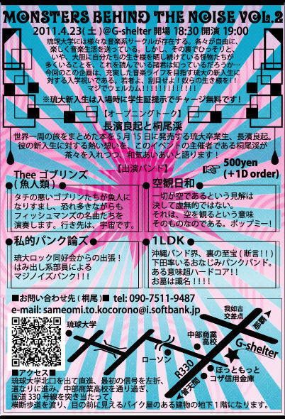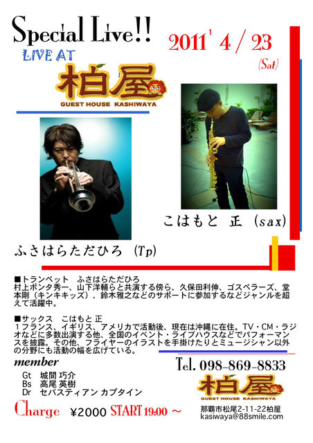 2011/4/23(Sat) 「Feeling Good Wind ?」 @D-set cafe(那覇市牧志) Open 19:00/Start 20:00 Charge \1,000(高校生以下\500) one drink order. 出演:阿良克磨・平川直樹/Sanemasa/ハリー☆増田/Building Blocks *2008年を最後に一度幕を降ろした自主企画「Feeling Good Wind」。約3年の時を経て豪華ゲストをお呼びしての再スタートです。当企画で得た収益は東日本大震災の義援金として被災地支援団体(どの団体かは当日の募集状況により決定します)に寄付致します。何か出来ることはないかと考えた末、僕等に出来ること。それは人を信じ、音楽を