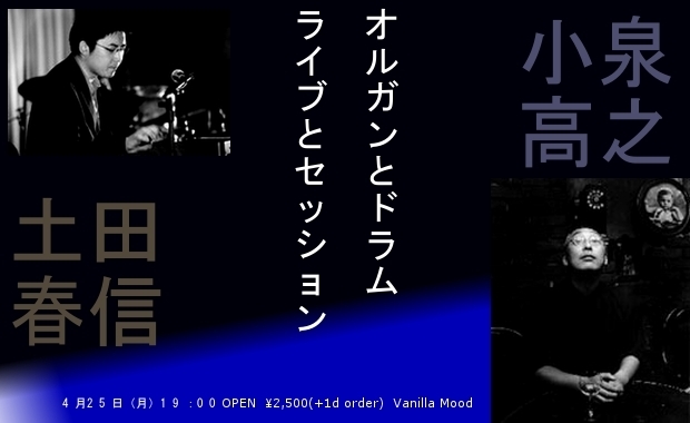 【注目のLive & Session @ Vanilla Mood】 小泉高之(ドラム) x 土田晴信(オルガン) ★★★☆☆☆★★★☆☆☆★★★☆☆☆★★★☆☆☆★★★☆☆☆ 4月25日(月)19:00 OPEN \2,500(+1d order) ライブ終了後はセッション!!楽器持参でのご来場大歓迎です!! ☆☆☆★★★☆☆☆★★★☆☆☆★★★☆☆☆★★★☆☆☆★★★ Vanilla Mood http://vanillamood-roppongi.com 小泉高之 プロフィール 1955年10月20日生まれ。 駒沢小学校。駒沢中学校。日大鶴が丘高校。日大農獣医学部食品工学科を卒業。 3歳位からピ