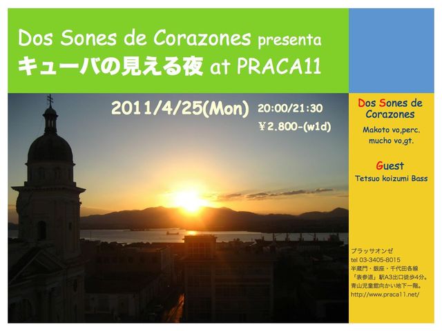 4/25(月)ドス・ソネス・デ・コラソネス with 小泉哲夫b. at 表参道プラッサ・オンゼ!(各氏敬称略) http://www.praca11.net/ ¥2.800-(w1d) 20:00/21:30 tel 0334058015 プラッサオンゼ 半蔵門・銀座・千代田各線「表参道」駅A3出口徒歩4分。 青山児童館向かい地下一階。 暖かくなって来ました。 気分もホカホカにお出かけはいかがでしょうか。