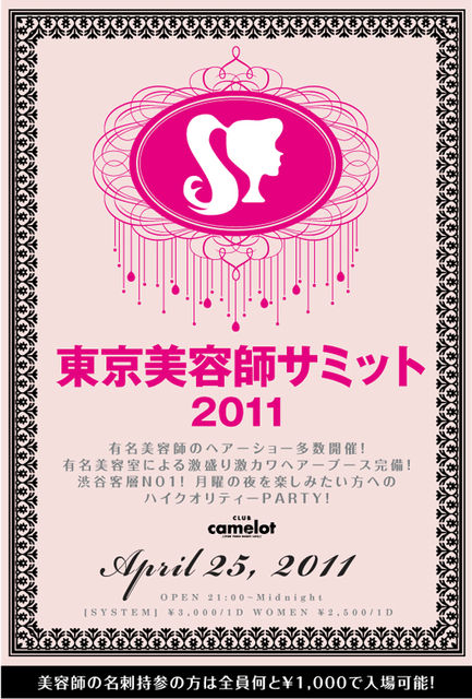 4-25 (月) 東京美容師Summit2010 渋谷キャメロットにて毎回500人 お洒落ボーイ、お洒落ガール率NO.1イベントです 超人気店舗のヘアーショー開催 都内有名美容室スタイリスト多数出演 日本最大規模の美容師ナイト 美容師,アパレルの客層でにぎわうパーティーです 都内有名店舗で活躍する人気スタイリストがDJを担当 ヘアーブースは勿論、超人気美容室によるヘアーショーやめちゃモテアレンジアドバイス等も開催 美容師同士の情報交換、