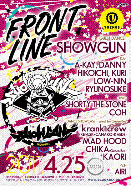 FRONT LINE@VUENOS http://vuenos.com/venue/events DATE: Monday / 4月25日 OPEN 23:00 ~ LATE PRICE: Entrance¥2500with1DRINK withflyer ¥2000with1DRINK GENRE: Hip Hop/R&B/REGGAE 毎月第四月曜日と言えば! ハイ、そうです。 「FRONT LINE」です。 毎月違ったGUESTを迎え DJ/ DANCE/ MCのHIPHOPの要素を全面に押し出していくPARTY!!! DJ A-KAYを中心としたレギュラーDJ!! SHORTY THE STONEのLIVE !! DANCE SHOWCASEは必見です!! 場所は渋谷VUENOS!!! 第4月曜日はぜひFRONT LINEへ