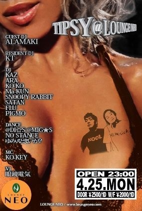 管理人様告知失礼します。 今夜4月25日(月)渋谷@Lounge NEOにて『TIPSY』が開催されます☆ 楽しく酔っぱらって最高の音楽を楽しもうというコンセプトを元に偶数月の第4月曜日に開催されている『TIPSY』☆ 今回Guest DJにはHARLEMにて毎週金曜日に開催されている『PUNCH OUT/BEAT RIP』からDJ ALAMAKI!!!!! そしてHARLEM『Kings Court』でOPEN UPを務め様々なイベントでメインを張るDJ KAZ!!!!! 他にも渋谷で活躍中の若手のDJ陣が今夜Lounge NEOの『TIPSY』を盛り上げちゃいます☆ そんなPARTYが通常¥2500かかってしま