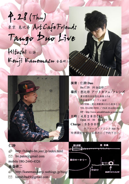 恵比寿 アートカフェ・フレンズ。 昨年も出演させていただきましたが 今回はお馴染みの仁詩・金益研二Duoでの演奏です。 4月28日(木)<東京・恵比寿> Duo Live! with 金益研二 ◆演奏:Bn:仁詩 Pf:金益研二 ◆場所:恵比寿 アートカフェ・フレンズ 東京都渋谷区恵比寿南1-7-8 恵比寿サウス・ワンB1F ACCESS:恵比寿駅西口から徒歩2分 TEL 03-6382-9050 / FAX 03-6382-9051 HP:http://www.artcafefriends.jp/index.html ◆Open 18:00 Stast 1