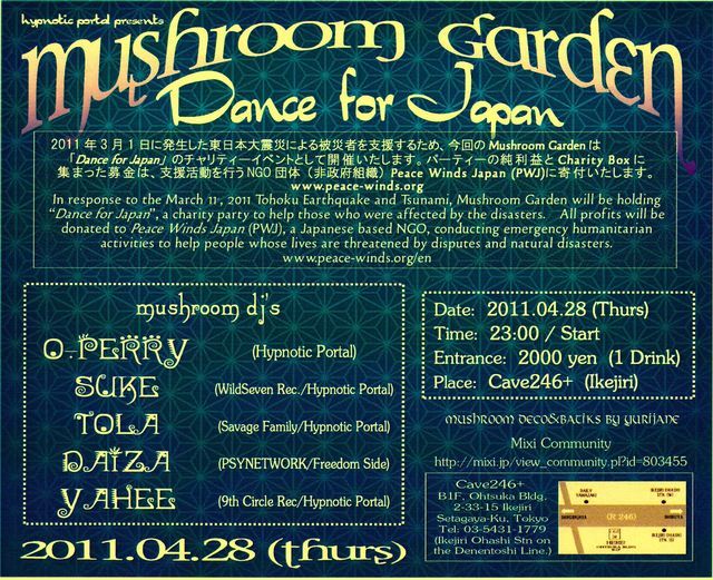 2011年3月1日に発生した東日本大震災による被災者を支援するため、今回のMushroom Gardenは「Dance for Japan」 のチャリティーイベントとして開催いたします。パーティーの純利益と