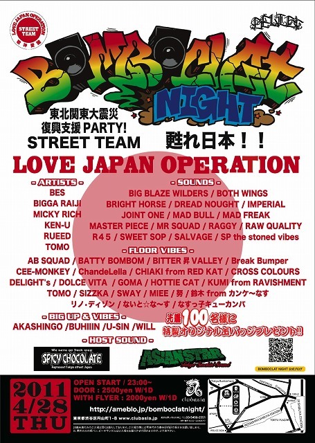 2011.4.28 (毎月第4木曜日 ) 祝前日 Tokyo's Legendary Street Party !! “BOMBOCLAT NIGHT” meets【STREET TEAM -LOVE JAPAN OPERATION-】 At. clubasia 東京都渋谷区円山町1-8 / TEL:03-5458-2551 Open:23:00〜 / DOOR:\3000(1Drink) ※ディスカウントゲストご希望の方はお気軽にメッセージください。 【GUEST ARTISTS】 BES /BIGGA RAIJI /DOMINO-KAT /KEN-U /MICKY RICH /RUEED /TOMO 【HOST SOUNDS】 SPICY CHOCOLATE /ASIAN STAR 【SOUNDS】 BIG BLAZE WILDERS /BOTH WINGS /BRIGHT HORSE / DREAD NOUGHT /I