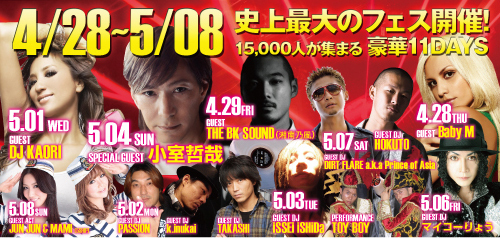 管理人様告知失礼します。 不適切な内容でしたらお手数ですが削除願います。 GWキャメロット史上最大のフェス開演 15,0000人が集まる豪華11DAYSの初日はMUSIC STATION Vol.2!! MAIN FLOORでは現在大注目の海外アーティストによるスペシャルライブ有り! HIPHOP FLOORはCAMELOT土曜日のレジデントDJであるDJ SATORU、a-life, axxcisなどディスコ箱を中心にDJ,オーガナイザーとして活躍中のDJ YOPPY、に加え都内で活躍するDJ陣が最新のHIT曲はもちろんの事、定番曲か ら懐かしの名曲まで幅広い選曲で朝まで踊れるフロアーでお