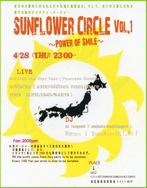 ・・・・・・・・・・・・・・・・・・・・ 管理人様、コミュの皆様、 告知になります。 よろしくお願い致します。 ・・・・・・・・・・・・・・・・・・・・ Sunflower Circleとは? 今回、東日本大震災により被災された地域の方々には、心よりお見舞い申し上げます。 そして、一日でも早い事態の終息及び地域の復興を願い、私たちは祈っております。 これから、復興していく為には大きな力と長い時間が必要です。 被災地の被害は考えているよりも大きいですし、支援も長期的に考える必要があります。 東日本大震災に合わ