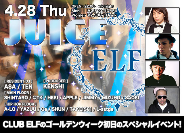 告知失礼します 4/28(祝前日) JUICE @ club ELF CLUB ELFのゴールデンウィークスペシャルイベント!!『JUICE』 メインフロアは最新のビルボードヒットやHIP HOP中心のオールジャンルフロア! !LMFAO、PITTBUL、LADY GAGA、などアゲチューンからしっとり聴けるR&Bまでみ んなの知っている曲だらけです ! ! お立ち台も設置!! ラウンジフロアは都内の様々なCLUBで活躍中のDJがゴリゴリなHIP HOPで展開!!SOUTH 、NEW YOKE、WESTSIDE、CLASSICなど、HIP HOP好きの為のフロアです!! ゲスト料金は通常価格