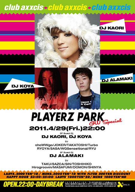 管理人様告知失礼します。 4/29(Fri.) "PLAYERZ PARK〜GW SPECIAL!〜"@axxcis OPEN/22:00〜 Guest: ・DJ KAORI ・DJ KOYA ・DJ ALAMAKI 今年のGWは5/2、5/6を含めると超特大の10連休!そんな今年のGW初日、4/29(祝)は、club axxcisにてこれまた超特大のPartyがっ! 説明不要・平日最強パーティーHARLEM火曜の"REDZONE"より『DJ KOYA』、未だ20代半ばながら世界のクラブシーンを意識したプレイスタイルで国内はもとより海外からも高い評価を受ける『DJ ALAMAKI』、そして、なんと、TheMostFamousJapaneseDJ『DJ KAORI』がaxx