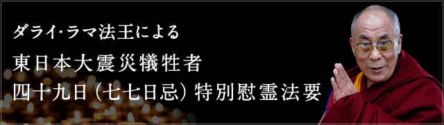 ダライ・ラマ法王による 「東日本大震災犠牲者四十九日(七七日忌)特別慰霊法要」 のお知らせ http://www.tibethouse.jp/event/2011/110429_houyou.html 3月11日、世界にかつてない東日本大震災によって多くの尊い命が犠牲になりましたこと、ご冥福を祈りますと共に、被災されました方々に心よりお見舞い申し上げます。 日本において、ダライ・ラマ法王による東日本大震災犠牲者四十九日(七七日忌)特別慰霊法要が開催の運びとなりましたこと連絡させていただきます。 4月28日が被災発生後49日目にあたり、仏教ではこの四十九日法要を行