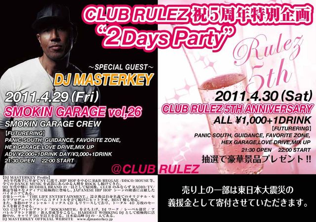 おかげ様でCLUB RULEZは5周年を迎える事になりました。 つきましては29日はSMOKIN GARAGE VOL.26、30日は5TH ANNVERSARYと題し、2Days Partyを開催します。 29日のSMOKIN GARAGE VOL.26には日本最高峰のDJ MASTERKEYを迎え開催。日本一のDJスキルをぜひ堪能してください。 4月29日 SMOKIN GARAGE VOL.26 4月30日 CLUB RULEZ 5TH ANNIVERSARY 【SMOKIN GARAGE VOL.26】 開催日時 2011年4月29日(金) OPEN 21:30 START 22:00 料金 ☆前売: 2,000yen (1 drink) ☆当日: 3,000yen (1 drink) ---------------------