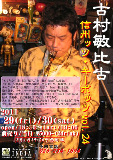 インディア・グループ本店の、「バーボンハウス・インディア」で、 恒例となりました、「古村敏比古」氏のソロ・ツアー、其の24開催のお知らせ…デス 今年は、浜田省吾氏のツアーも始まるようで、古村氏のライブも、少なくなるかも……デス 詳細はポスター をアップしてあります。 2月1日19時から、予約受け付けます。
