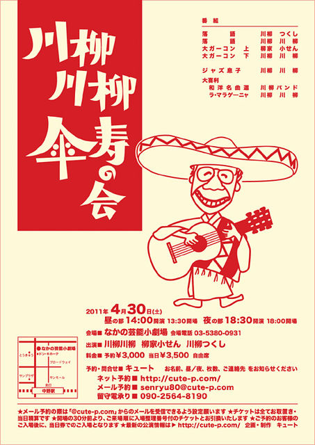 珠玉の名作ツートップ、圓生直伝の古典、 そして名曲『ラ・マラゲーニャ』、 傘寿をむかえて大奮闘の記念公演です。お見逃しなく! 日時 2011年4月30日(土) ※昼夜2回公演  昼の部 開演 14:00 (開場 13:30)  夜の部 開演 18:30 (開場 18:00) 会場 なかの芸能小劇場 JR線・東西線 中野駅下車徒歩5分 料金 予約¥3,000/当日¥3,500 (全席自由) 出演 川柳川柳、柳家小せん、川柳つくし 番組(予定)   落 語      川柳つくし   落 語      川柳川柳   大ガーコン 上  柳家小せん   大ガーコン