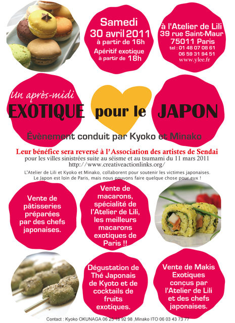 日本から遠くはなれたフランスでも、被災地支援の気持ちを行動で表したいという思いから、フランスの食文化を料理教室というかたちで日本人に紹介している”アンリシール”の主催者(伊藤美奈子、奥永恭子)と、"アトリエ・ド・リリ”の主宰者(イヴィリンヌ・リー)を中心に、パリで活躍する食のスペシャリストや愛好家の協力を得て、食のチャリティーイベントを開催いたします。