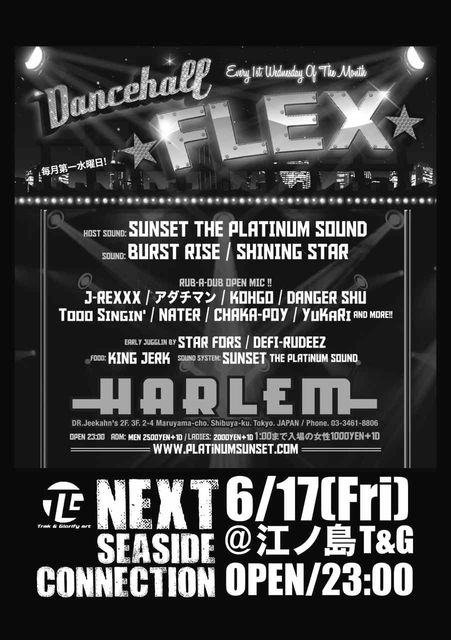 今月のSea Side Connection は毎月第一水曜日渋谷HARLEMで行われている【★DANCEHALL FLEX★】の DeeJay陣が湘南に!!