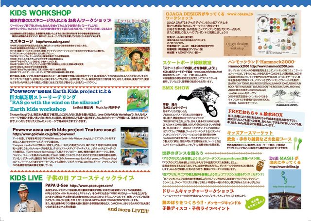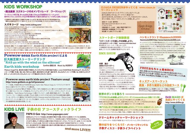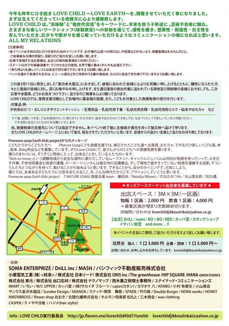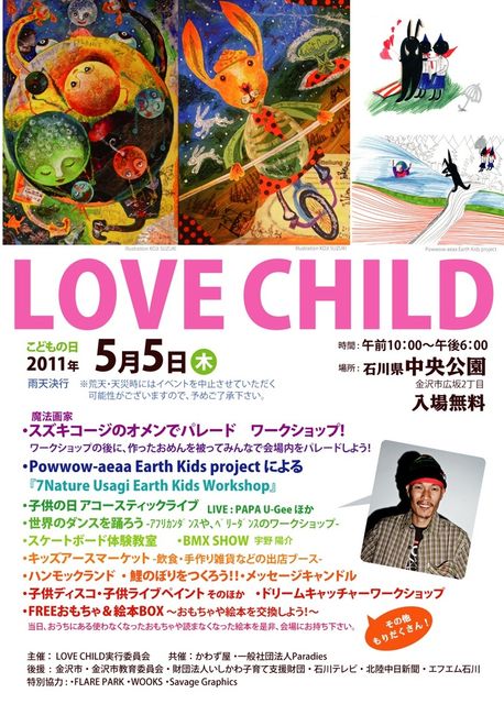告知失礼いたします。 昨年にひき続き、今年も5月5日の子供の日に子供を対象とした(もちろん大人も参加できます。)体験型の入場無料イベント「LOVE CHILD」を行います!! 是非、みなさん遊びに来て下さいね!! 「LOVE CHILD」 開催日時:2011年5月5日(木)子供の日 午前10:00〜午後18:00(予定) (雨天決行 ※荒天・天災時にはイベントを中止させていただく可能性がございますので、予めご了承下さい。) 開催場所:石川県中央公園 入場無料 (イベント内容) ●魔法画家 スズキコージのオメンでパレード ワークショップ!