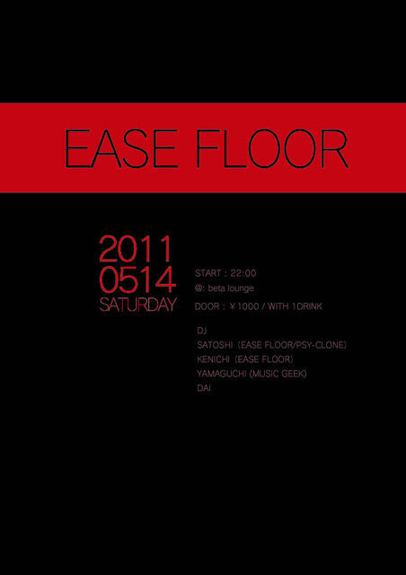管理人様告知失礼致します。 EASE FLOOR beta loungeにて2回目の開催となるTECHNO PARTY!! <EASE FLOOR> 今回は富山県よりMINORITYで開催されているHOUSE&TECHNO PARTY 「MUSIC GEEK」 のオーガナイザー、DJ YAMAGUCHI & 富山を拠点に金沢でも活動している女性VJ、VJ Marbleの二人の富山勢と、 金沢を中心に活動している若手DJ、DJ DAI の計三人を迎えてレギュラーパーティー Tech Tribeとはまた違う世界観をお届けします! 日時 : 2011.05.14 (SAT) 場所 : beta lounge START : 22:00 入場