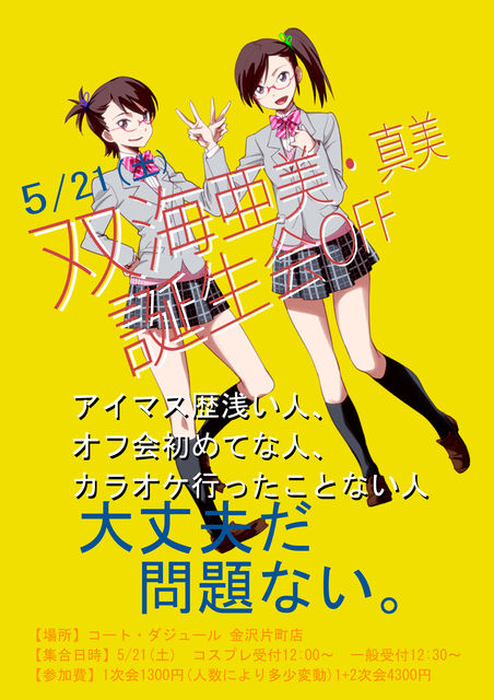 アイマス歴浅い人、オフ会初めてな人、カラオケ行ったことない人 大 丈 夫 だ 問 題 な い 。 そういう人のためのオフです オタ芸打ちたい人、コールしたいひと、踊りたい人 一 番 良 い の を 頼 む 。 【集合日時】5/21(土) 受付13:30〜 開幕14:00 二次会18:20〜 【場所】コート・ダジュール 金沢片町店 二次会 いろはにほへと 片町店 【参加費】1次会1300円(人数により多少変動) 1+2次会4300円 参加表明テンプレート 【Pネーム】 【担当アイドル】 【二次会の参加】 【一言】(コスプレされる方はここにお書